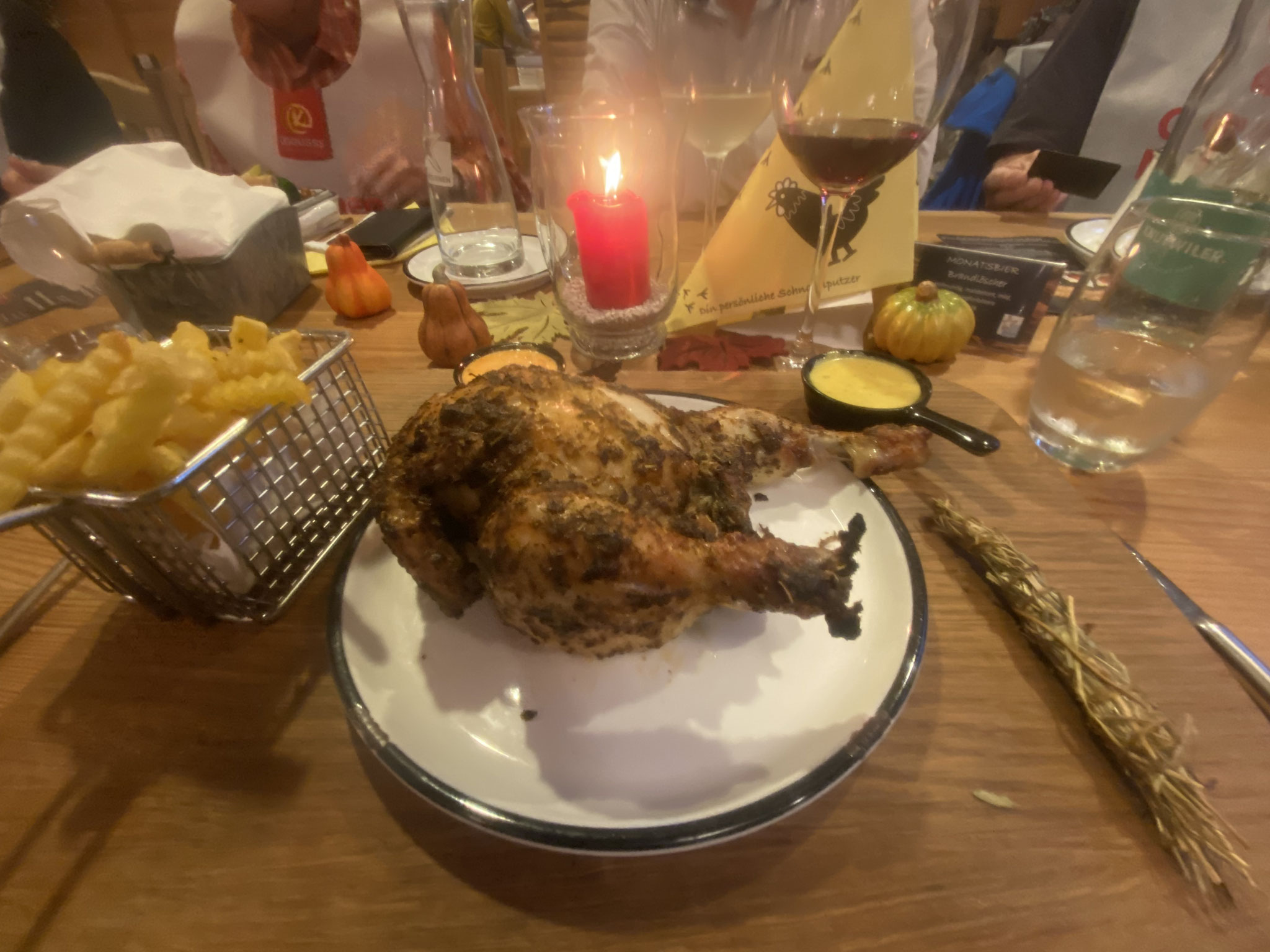 Schon bald konnten wir unser Essen in Empfang nehmen. Komischerweise haben alle "Güggeli" bestellt.